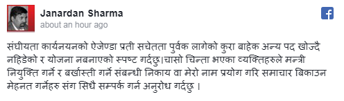 उनले चासो चिन्ता भएका व्यक्तिहरुले मन्त्री नियुक्ति गर्ने र बर्खास्ती गर्ने सम्बन्धी निकाय वा आफ्नो नाम प्रयोग गरि समाचार प्रकाशित गर्नेहरुलाई सत्यतथ्य बुझेर लेख्न पनि आग्रह गरेका छन् ।
