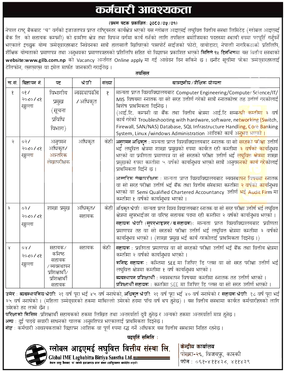 ग्लोबल आइएमई लघुवित्तले खुलायो यी पदमा रोजगारको अवसर