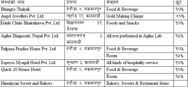 उक्त संस्थाहरु र प्राप्त गर्न सकिने छुट निम्नलिखित छन् :