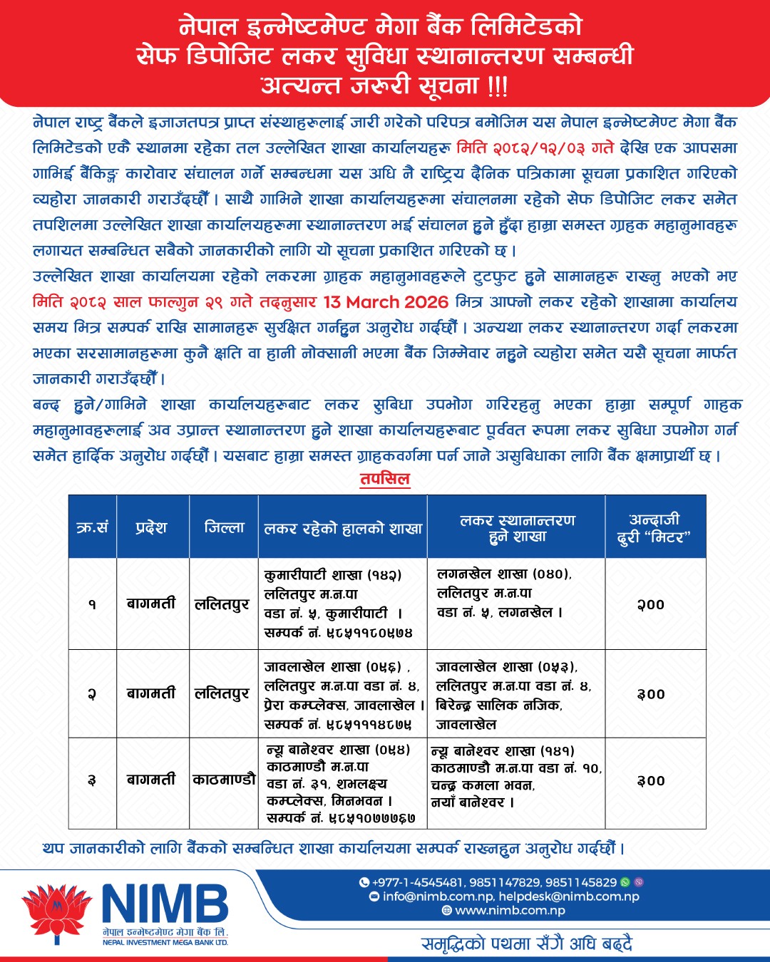 नेपाल इन्भेस्टमेन्ट मेगा बैंकको लकर सेवा अन्य शाखामा स्थानान्तरण